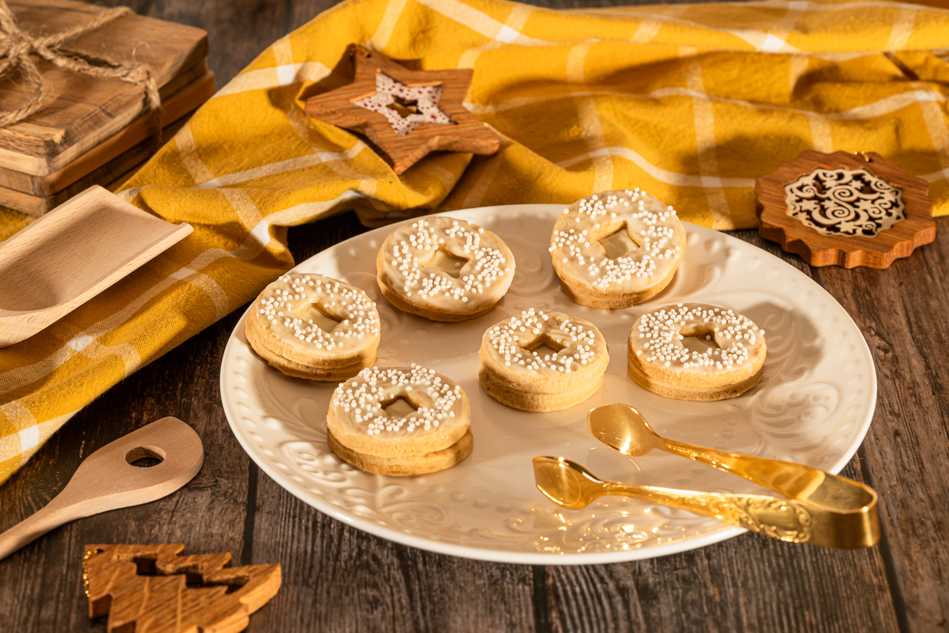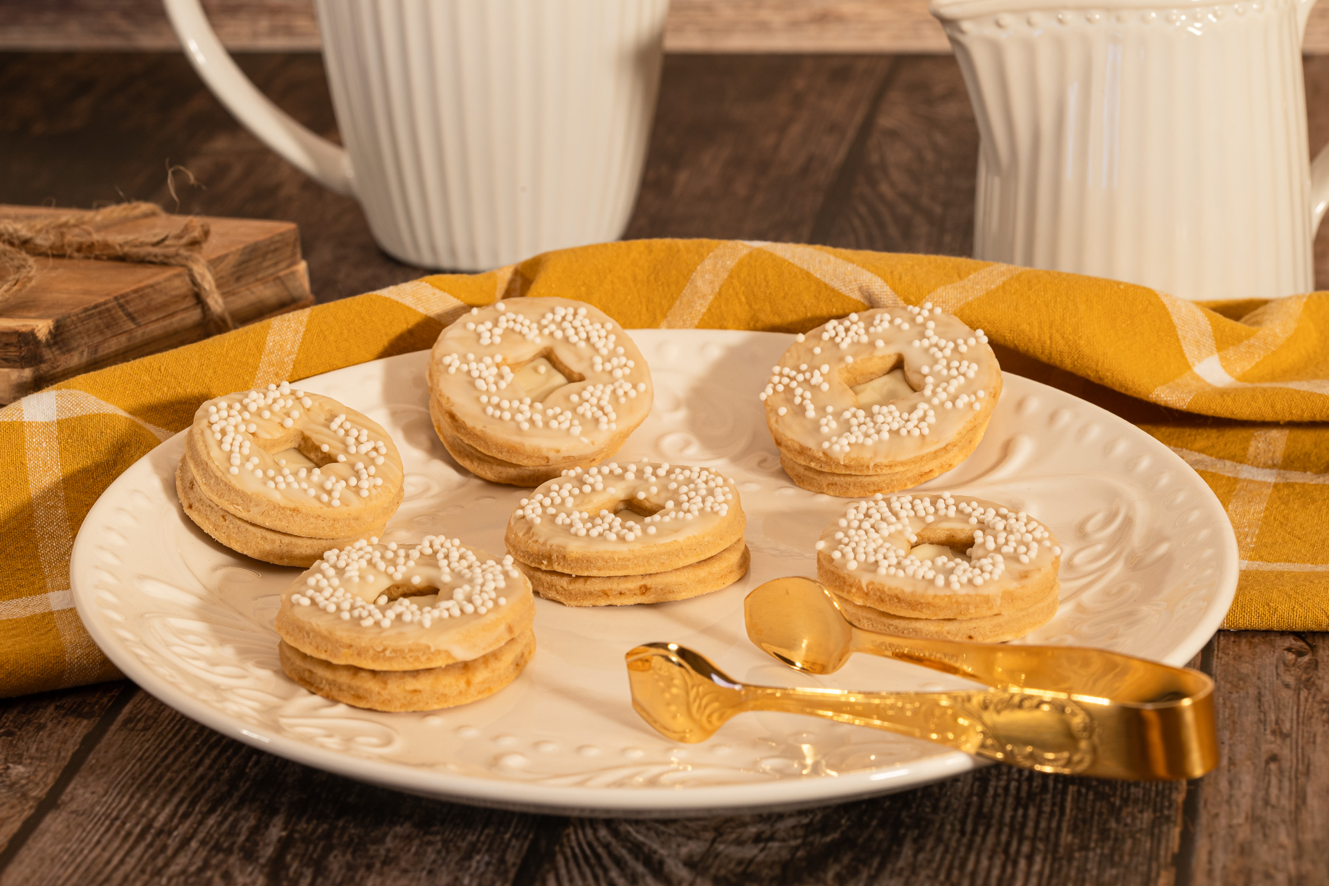 Zarter Mandel-Mürbteig trifft auf weiße Schokoladencreme. Abgerundet durch die zartschimmernden Zuckerperlen.